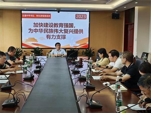 大会首先由公道中学党总支书记、校长李兆兵以“加快建设教育强国,为中华民族伟大复兴提供有力支撑”为题,为全体党员教师讲专题党课。李校长强调要把习近平总书记在中共中央政治局第五次集体学习时的重要讲话精神融入主题教育,要全面贯彻党的教育方针,坚持以人民为中心发展教育,主动超前布局、有力应对变局、奋力开拓新局,加快推进教育现代化,以教育之力厚植人民幸福之本,以教育之强夯实国家富强之基,为全面推进中华民族伟大复兴提供有力支撑。