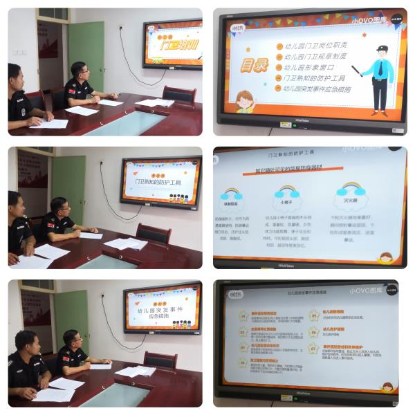为了防范发生各类安全事故,维护正常的幼儿园教学秩序,确保在园师生人身安全和幼儿园财产安全,培训中从全岗位工作职责、规章制度、熟知防护工具、应急措施等方面向保安人员进行全面的讲解培训。