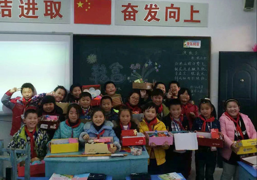 12月7日,初冬的早晨传来阵阵寒意,而真武小学三(1)中队的教室里却暖意融融,“鞋盒礼物”公益爱心活动正在进行中。只见孩子们将自己精心挑选的学习用品、袜子、围巾、小饰品、玩具等各种各样的礼物装进鞋盒里,再放上一张写满祝福的爱心卡,用漂亮的彩纸包装好鞋盒,最后孩子们还要亲手填上快递单,幸福的笑容写满了一张张充满童真的脸。